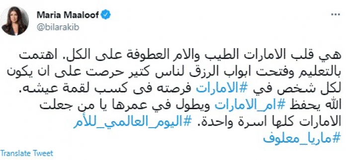 أشادت الإعلامية اللبنانية ماريا معلوف، بأم الإمارات الشيخة فاطمة بنت مبارك.