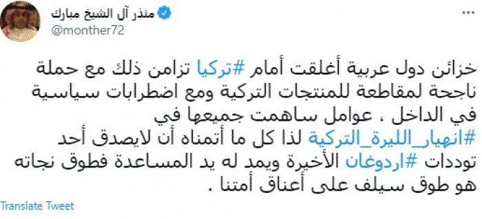 وقال في تغريدة عبر "تويتر" رصدها "المشهد العربي": "خزائن دول عربية أغلقت أمام تركيا تزامن ذلك مع حملة ناجحة لمقاطعة للمنتجات التركية ومع اضطرابات سياسية في الداخل، عوامل ساهمت جميعها في انهيار الليرة التركية لذا كل ما أتمناه أن لا يصدق أحد توددات أردوغان الأخيرة ويمد له يد المساعدة فطوق نجاته هو طوق سيلف على أعناق أمتنا".