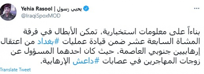 وقال في تغريدة عبر "تويتر" رصدها "المشهد العربي": "بناءاً على معلومات استخبارية، تمكن الأبطال في فرقة المشاة السابعة عشر ضمن قيادة عمليات بغداد من اعتقال إرهابيين جنوبي العاصمة، حيث كان احدهما المسؤول عن زوجات المهاجرين في عصابات داعش الإرهابية".