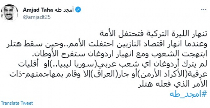وقال في تغريدة عبر "تويتر" رصدها "المشهد العربي": "تنهار الليرة التركية فتحتفل الأمة وعندما انهار اقتصاد النازيين احتفلت الأمم..وحين سقط هتلر ابتهجت الشعوب ومع انهيار أردوغان ستفرح الأوطان".