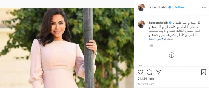 ونشر "حبيب" صورة شيرين، عبر حسابه الرسمي بموقع "إنستجرام"، وعلق: "كل سنة وأنتي طيبة يا حبيبتي يا أحلى أم، كل سنة وأمي حبيبتي الغالية طيبة ويارب يخليكي ليا يا أمي، وكل أم مصرية بخير وصحة وسعادة".