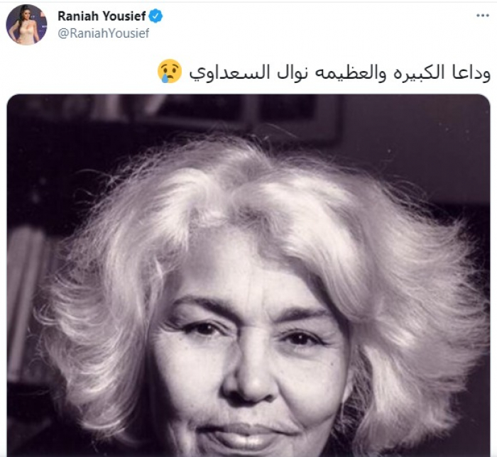 ونشرت رانيا يوسف صورة "السعداوي"، عبر حسابها الرسمي بموقع "تويتر"، وعلقت: "وداعًا الكبيرة والعظيمة نوال السعداوي".