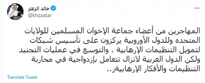 وكتب في تغريدة عبر "تويتر" رصدها "المشهد العربي": "المهاجرين من أعضاء جماعة الإخوان المسلمين للولايات المتحده وللدول الأوروبية يركزون على تأسيس شبكات لتمويل التنظيمات الإرهابية ، والتوسع في عمليات التجنيد ولكن الدول الغربية لاتزال تتعامل بإزدواجية في محاربة التنظيمات والأفكار الإرهابية".
