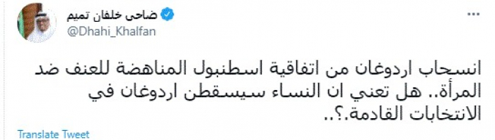 وقال في تغريدة عبر "تويتر" رصدها "المشهد العربي": "انسحاب أردوغان من اتفاقية إسطنبول المناهضة للعنف ضد المرأة.. هل تعني أن النساء سيسقطن أردوغان في الانتخابات القادمة؟".