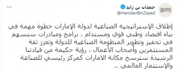 وقال في تغريدة على حسابه بموقع التدوين المصغر تويتر، اليوم إن: "إطلاق الاستراتيجية الصناعية لدولة الإمارات خطوة مهمة في بناء اقتصاد وطني قوي ومستدام".