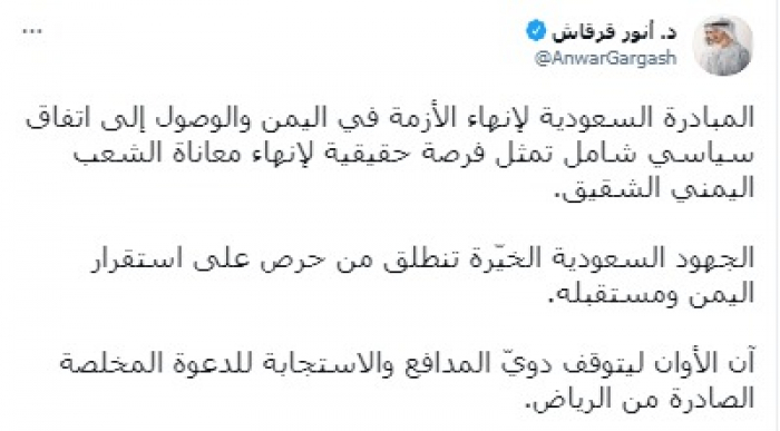 أشاد المستشار الدبلوماسي لرئيس الإمارات، الدكتور أنور بن محمد قرقاش، بالمبادرة السعودية لإنهاء الحرب في اليمن.