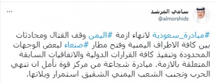 وشدد في تغريدة على حسابه بموقع التدوين المصغر تويتر، اليوم على أن: "مبادرة السعودية لإنهاء أزمة اليمن ووقف القتال ومحادثات بين كافة الأطراف اليمنية وفتح مطار صنعاء، لبعض الوجهات المحدودة وتنفيذ كافة القرارات الدولية والاتفاقيات السابقة المتعلقة بالأزمة، مبادرة شجاعة من مركز قوة".