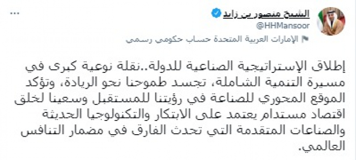 وصف الشيخ منصور بن زايد آل نهيان، نائب رئيس مجلس الوزراء بدولة الإمارات العربية المتحدة، وزير شؤون الرئاسة، الاستراتيجية الصناعية للدولة، بأنها نقلة على مسيرة التنمية.