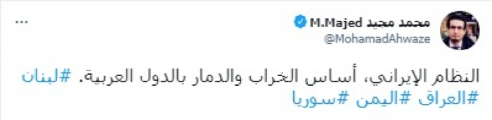وقال في تغريدة على حسابه بموقع التدوين المصغر تويتر، اليوم إن: "النظام الإيراني، أساس الخراب والدمار بالدول العربية، مختتما بهاشتاج: "لبنان العراق اليمن سوريا".