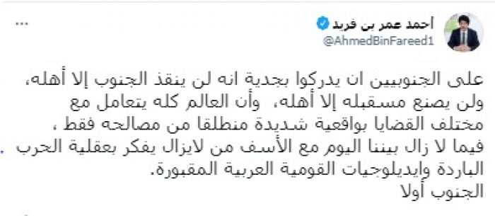 ونبه في تغريدة على حسابه بموقع التدوين المصغر تويتر، اليوم إلى أنه: "على الجنوبيين أن يدركوا بجدية أنه لن ينقذ الجنوب إلا أهله، ولن يصنع مسقبله إلا أهله".