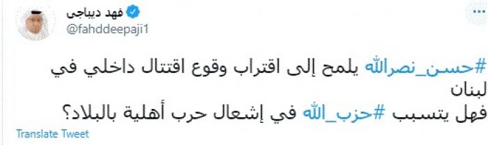 وقال في تغريدة عبر "تويتر" رصدها "المشهد العربي": "حسن نصرالله يلمح إلى اقتراب وقوع اقتتال داخلي في لبنان.. فهل يتسبب حزب الله في إشعال حرب أهلية بالبلاد؟".
