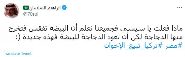 وقال في تغريدة عبر "تويتر" رصدها "المشهد العربي": "ماذا فعلت يا سيسي فجميعنا نعلم أن البيضة .... فتخرج منها الدجاجة لكن أن تعود الدجاجة للبيضة فهذه جديدة".