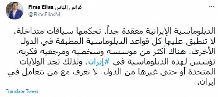 وقال في تغريدة عبر "تويتر" رصدها "المشهد العربي": "الدبلوماسية الإيرانية معقدة جداً، تحكمها سياقات متداخلة، لا تنطبق عليها كل قواعد الدبلوماسية المطبقة في الدول الأخرى، هناك أكثر من مؤسسة وشخصية ومرجعية فكرية، تؤسس لهذه الدبلوماسية في إيران، ولذلك تجد الولايات المتحدة أو حتى غيرها من الدول، لا تعرف مع من تتعامل في إيران".