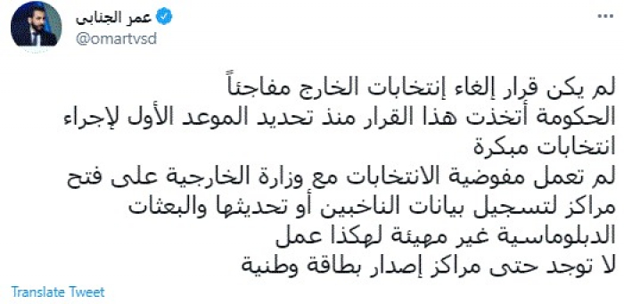 وقال في تغريدة عبر "تويتر" رصدها "المشهد العربي": "لم يكن قرار إلغاء إنتخابات الخارج مفاجئاً.. الحكومة أتخذت هذا القرار منذ تحديد الموعد الأول لإجراء انتخابات مبكرة.. لم تعمل مفوضية الانتخابات مع وزارة الخارجية على فتح مراكز لتسجيل بيانات الناخبين أو تحديثها والبعثات الدبلوماسية غير مهيئة لهكذا عمل.. لا توجد حتى مراكز إصدار بطاقة وطنية".