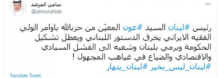 وقال في تغريدة عبر "تويتر" رصدها "المشهد العربي": "رئيس لبنان السيد عون المعيّن من حزب الله بأوامر الولي الفقيه الايراني يخرق الدستور اللبناني ويعطل تشكيل الحكومة ويرمي بلبنان وشعبه إلى الفشل السيادي والاقتصادي والضياع في غياهب المجهول".