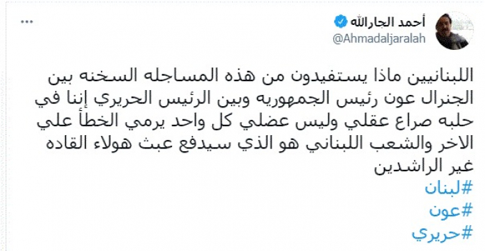 وقال في تغريدة عبر "تويتر" رصدها "المشهد العربي": "اللبنانيين ماذا يستفيدون من هذه المساجلة السخنة بين الجنرال عون رئيس الجمهورية وبين الرئيس الحريري إننا في حلبة صراع عقلي وليس عضلي كل واحد يرمي الخطأ علي الآخر والشعب اللبناني هو الذي سيدفع عبث هؤلاء القادة غير الراشدين".