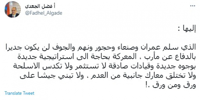 وكتب في تغريدة عبر "تويتر" رصدها "المشهد العربي": "الذي سلم عمران وصنعاء وحجور ونهم والجوف لن يكون جديرًا بالدفاع عن مأرب، المعركة بحاجة إلى استراتيجية جديدة بوجوه جديدة وقيادات صادقة لا تستثمر ولا تكدس الأسلحة ولا تختلق معارك جانبية من العدم، ولا تبني جيشًا على ورق ومن ورق".