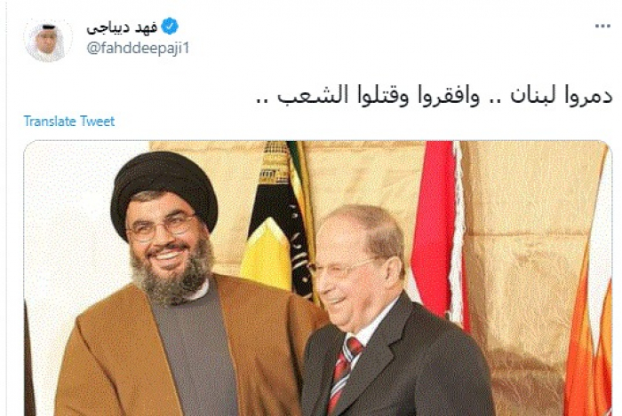 وجه المحلل السياسي السعودي فهد ديباجي، اليوم، انتقادًا لاذعًا للأمين العام لحزب الله حسن نصرالله، والرئيس اللبناني ميشال عون.