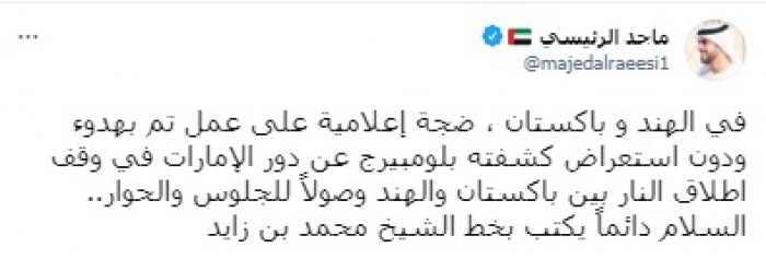 وأشار في تغريدة على حسابه بموقع التدوين المصغر تويتر، اليوم إلى أنه: "في الهند وباكستان ، ضجة إعلامية على عمل تم بهدوء ودون استعراض كشفته بلومبيرج عن دور الإمارات في وقف إطلاق النار بين باكستان والهند وصولاً للجلوس والحوار".