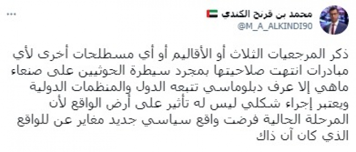 وأكد في تغريدة على حسابه بموقع التدوين المصغر تويتر، اليوم أن: "ذكر المرجعيات الثلاث أو الأقاليم أو أي مصطلحات أخرى لأي مبادرات انتهت صلاحيتها بمجرد سيطرة الحوثيين على صنعاء ما هي إلا عرف دبلوماسي تتبعه الدول والمنظمات الدولية".