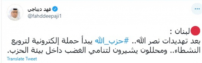 وكتب في تغريدة عبر "تويتر" رصدها "المشهد العربي": "لبنان: بعد تهديدات نصر الله.. حزب الله يبدأ حملة إلكترونية لترويع النشطاء.. ومحللون يشيرون لتنامي الغضب داخل بيئة الحزب".