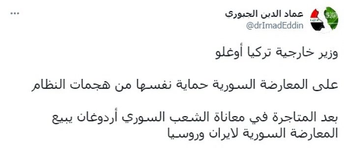 وكتب في تغريدة عبر "تويتر" رصدها "المشهد العربي": "وزير خارجية تركيا أوغلو.. على المعارضة السورية حماية نفسها من هجمات النظام.. بعد المتاجرة في معاناة الشعب السوري أردوغان يبيع المعارضة السورية لإيران وروسيا".
