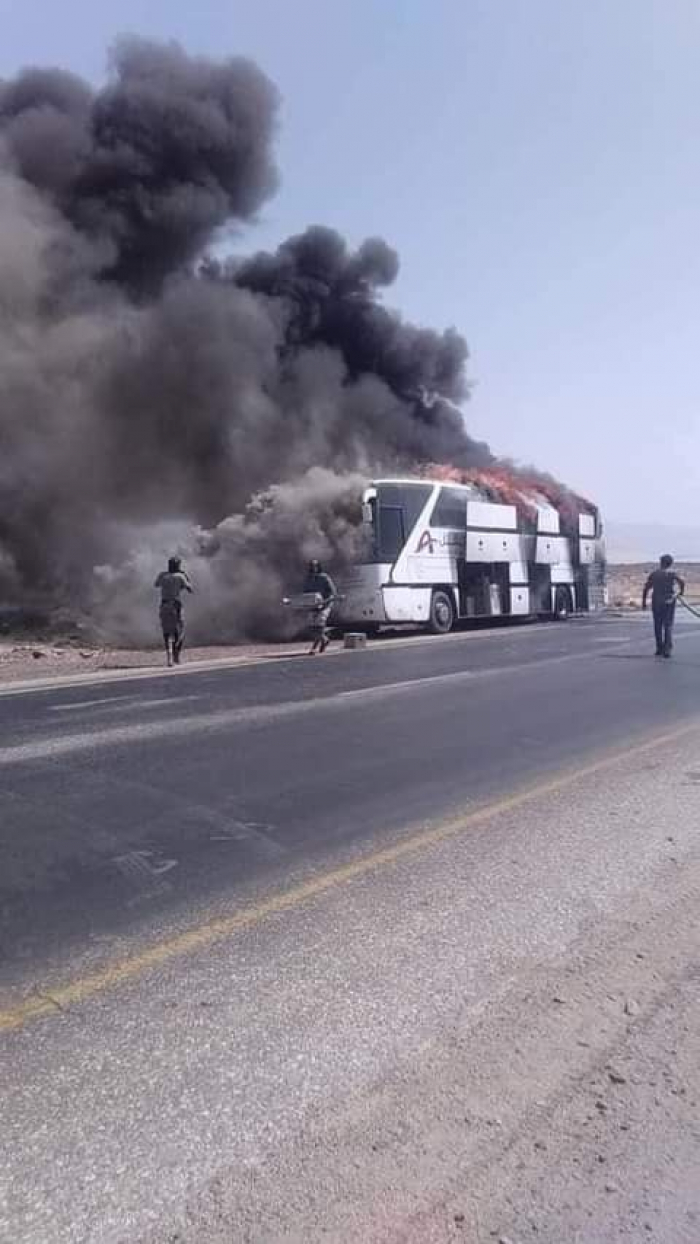 اندلع حريق هائل اليوم الأربعاء، في حافلة نقل جماعي بالخط الرابط بين محافظتي حضرموت وشبوة.