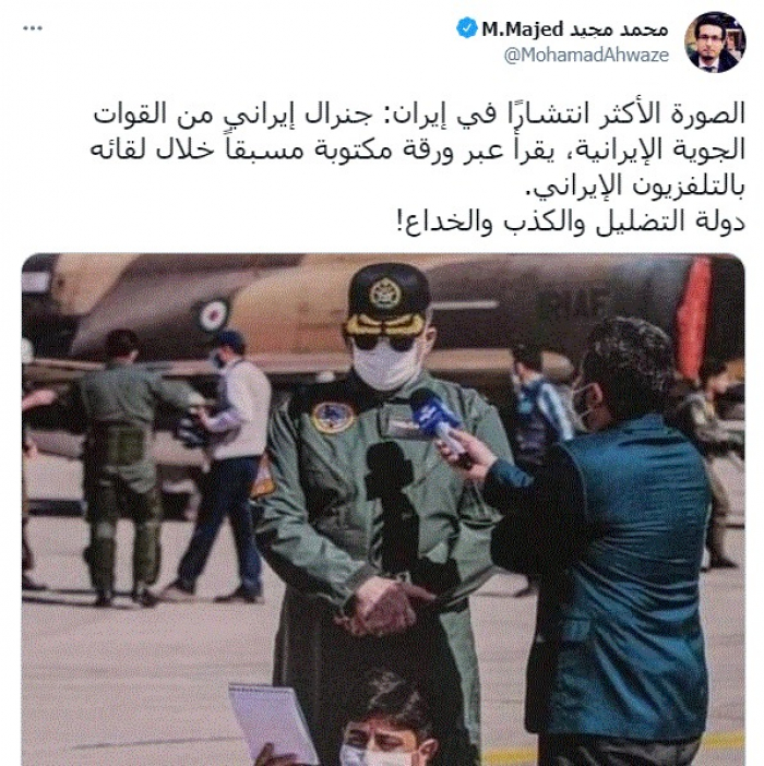 وقال في تغريدة عبر "تويتر" رصدها "المشهد العربي": "الصورة الأكثر انتشارًا في إيران: جنرال إيراني من القوات الجوية الإيرانية، يقرأ عبر ورقة مكتوبة مسبقاً خلال لقائه بالتلفزيون الإيراني. دولة التضليل والكذب والخداع".