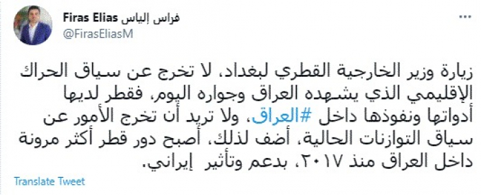 وقال في تغريدة عبر "تويتر" رصدها "المشهد العربي": "زيارة وزير الخارجية القطري لبغداد، لا تخرج عن سياق الحراك الإقليمي الذي يشهده العراق وجواره اليوم، فقطر لديها أدواتها ونفوذها داخل العراق، ولا تريد أن تخرج الأمور عن سياق التوازنات الحالية، أضف لذلك، أصبح دور قطر أكثر مرونة داخل العراق منذ ٢٠١٧، بدعم وتأثير إيراني".