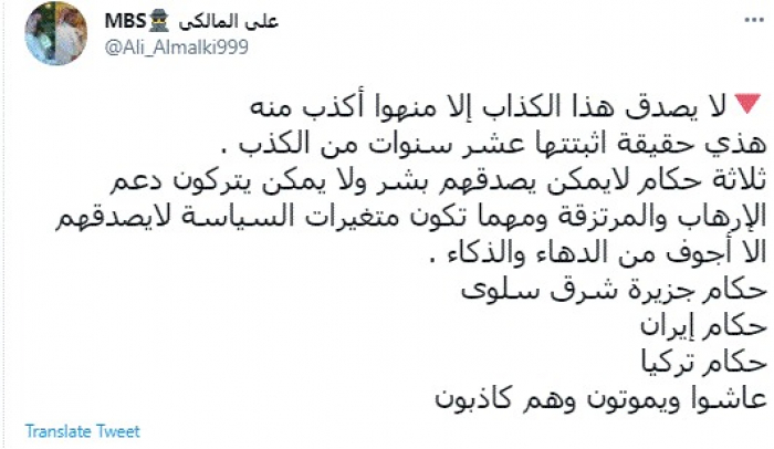 وأضاف: "ثلاثة حكام لايمكن يصدقهم بشر ولا يمكن يتركون دعم الإرهاب والمرتزقة ومهما تكون متغيرات السياسة لايصدقهم الا أجوف من الدهاء والذكاء. حكام جزيرة شرق سلوى وإيران وتركيا.. عاشوا ويموتون وهم كاذبون".