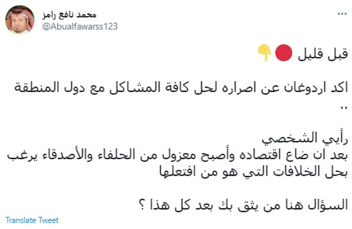 وقال في تغريدة عبر "تويتر" رصدها "المشهد العربي": "قبل قليل أكد أردوغان عن إصراره لحل كافة المشاكل مع دول المنطقة.. رأيي الشخصي بعد أن ضاع اقتصاده وأصبح معزول من الحلفاء والأصدقاء يرغب بحل الخلافات التي هو من افتعلها السؤال هنا من يثق بك بعد كل هذا؟".