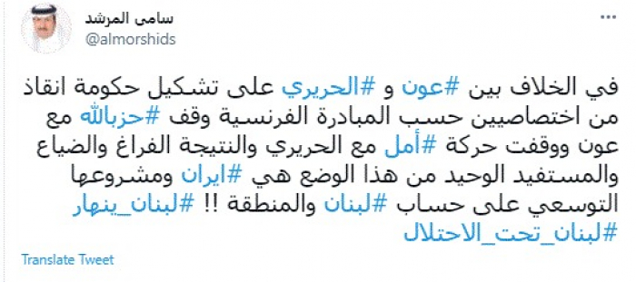 وقال في تغريدة عبر "تويتر" رصدها "المشهد العربي": "في الخلاف بين عون والحريري على تشكيل حكومة إنقاذ من اختصاصيين حسب المبادرة الفرنسية وقف حزب الله مع عون ووقفت حركة أمل مع الحريري والنتيجة الفراغ والضياع والمستفيد الوحيد من هذا الوضع هي إيران ومشروعها التوسعي على حساب لبنان والمنطقة".