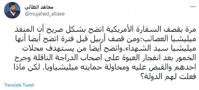 وقال في تغريدة عبر "تويتر" رصدها "المشهد العربي": "مرة بقصف السفارة الأمريكية اتضح بشكل صريح أن المنفذ ميليشيا العصائب؛ومن قصف أربيل قبل فترة اتضح أيضا أنها ميليشيا سيد الشهداء، واتضح أيضا من يستهدف محلات الخمور بعد انفجار العبوة على أصحاب الدراجة الناقلة وجرح احدهم والقبض عليه ومحاولة حمايته ميليشياويا. لكن ماذا فعلت لهم الدولة؟".