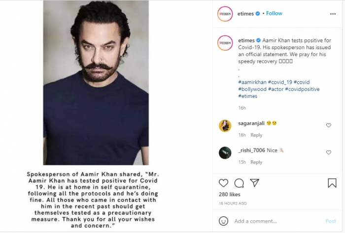 وبحسب موقع ETIMES، فإن المتحدث باسم خان أصدر بيانًا كشف خلاله عن إصابة نجم بوليود بالفيروس، وقال: "ثبتت إصابة عامر خان بفيروس Covid 19، وإنه في المنزل في الحجر الصحي الذاتي، يتبع جميع البروتوكولات وهو بخير، مطالبا جميع من تواصلوا معه في الفترة القليلة الماضية بالخضوع للاختبارات كإجراء احترازي".