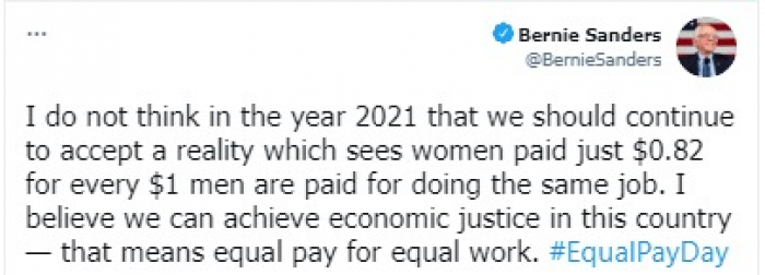 وقال في تغريدة على حسابه بموقع التدوين المصغر تويتر، اليوم إني: "لا أعتقد أنه في عام 2021 يجب أن نستمر في قبول حقيقة أن النساء يتلقين 0.82 دولار بينما يحصل الرجل على دولار واحد مقابل القيام بنفس الوظيفة".