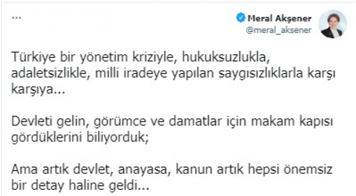 وأكدت في تغريدة على حسابها بموقع التدوين المصغر تويتر، اليوم أن: "تركيا بأزمة إدارية، وشرعية، وظلم، وعدم احترام للإرادة الوطنية".
