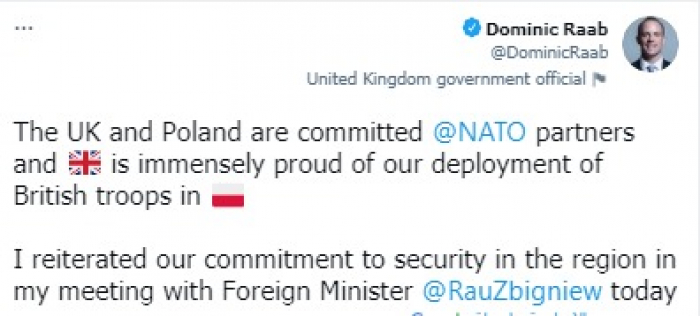 وقال في تغريدة على حسابه بموقع التدوين المصغر تويتر، اليوم إن: "المملكة المتحدة وبولندا ملتزمان بحلف شمال الأطلسي"