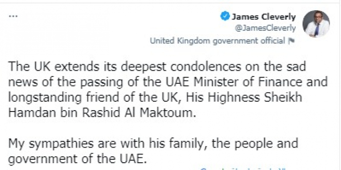 وقال في تغريدة على حسابه بموقع التدوين المصغر تويتر، اليوم إنه: "تتقدم المملكة المتحدة بأحر التعازي في نبأ وفاة وزير المالية الإماراتي والصديق العريق للمملكة المتحدة، سمو الشيخ حمدان بن راشد آل مكتوم".