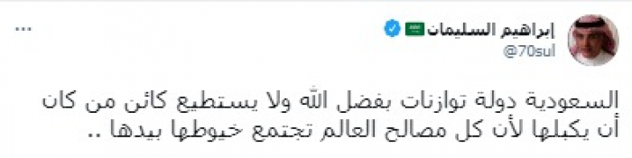 وقال في تغريدة على حسابه بموقع التدوين المصغر تويتر، اليوم إن: "السعودية دولة توازنات بفضل الله"
