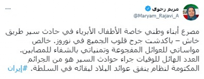اعتبرت زعيمة المعارضة الإيرانية مريم رجوي، أن تصاعد ضحايا حوادث المرور نتيجة لإنفاق نظام ملالي طهران عوائد البلاد لضمان بقائه في السلطة.