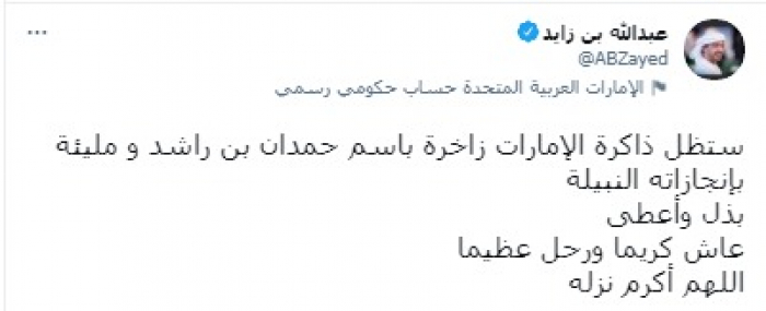 نعى وزير خارجية دولة الإمارات العربية المتحدة، عبدالله بن زايد، الشيخ حمدان بن راشد، مؤكدا أن ذاكرة الوطن زاخرة باسمه.
