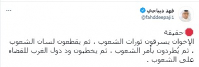 وشدد في تغريدة على حسابه بموقع التدوين المصغر تويتر، اليوم على أنه: "حقيقة الإخوان يسرقون ثورات الشعوب، ثم يقطعون لسان الشعوب، ثم يُطردون بأمر الشعوب، ثم يخطبون ود دول الغرب للقضاء على الشعوب" .