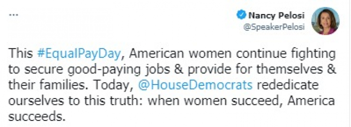 وقالت في تغريدة على حسابها بموقع التدوين المصغر تويتر، اليوم أنه: "في يوم المساواة في الأجور تواصل النساء الأميركيات الكفاح من أجل تأمين وظائف جيدة الأجر وإعالة أنفسهن وأسرهن".