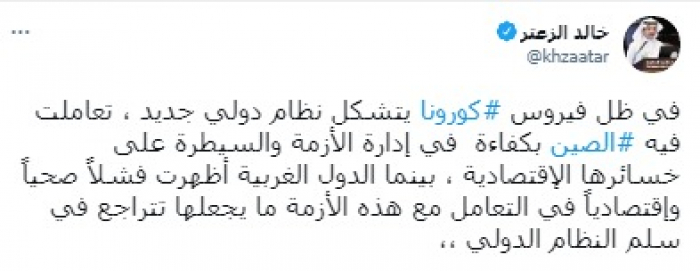 وأشار في تغريدة على حسابه بموقع التدوين المصغر تويتر، اليوم إلى أنه: "في ظل فيروس كورونا يتشكل نظام دولي جديد، تعاملت فيه الصين بكفاءة في إدارة الأزمة والسيطرة على خسائرها الاقتصادية".