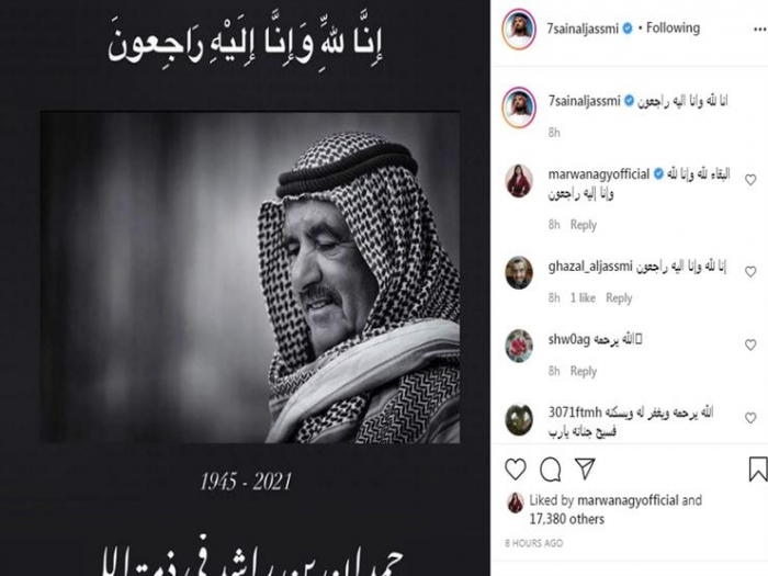 ونشر "الجسمي" صورة للشيخ حمدان بن راشد، عبر حسابه الرسمي بموقع "إنستجرام"، وعلق :"إنا لله وإنا إليه راجعون".