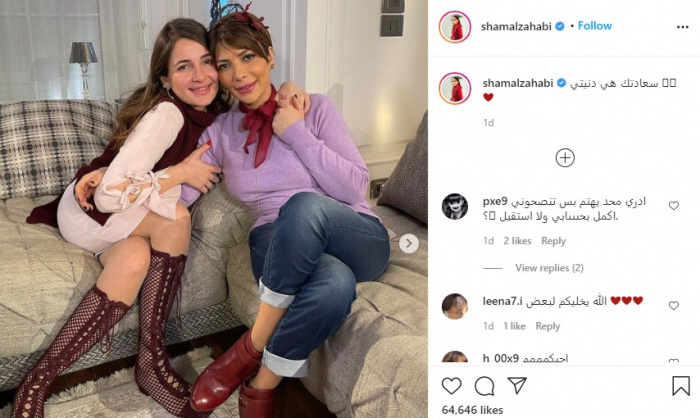 ونشرت شام صورًا تجمعهما، عبر حسابها الرسمي بموقع "إنستجرام"، وعلقت: "سعادتك هي دنيتي".