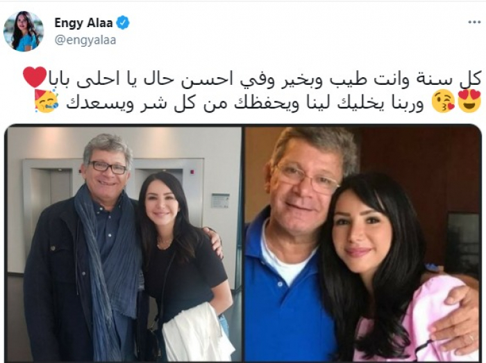 ونشرت "علاء" صورة مجمعة لها ولوالدها في إطار واحد، عبر حسابها الرسمي بموقع "تويتر"، وعلقت: "كل سنة وأنت طيب وبخير وفي أحسن حال يا أحلى بابا، وربنا يخليك لينا ويحفظك من كل شر ويسعدك".