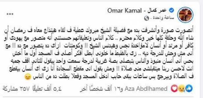 وعلق "عمر"، على الانتقادات من خلال حسابه بموقع "فيس بوك"، قائلًا: "اتصورت صورة واتشرفت بده مع فضيلة الشيخ مبروك عطية في لقاء هيتذاع معاه في رمضان إن شاء الله وحلقة كلها خير وكلام محترم، كلام الناس وتعليقاتهم حسستني إنه متصور مع كافر أو مرتد، كومنتات كلها إزاي ده يتصور مع ده!! مع إني مش وحش للدرجة دي".