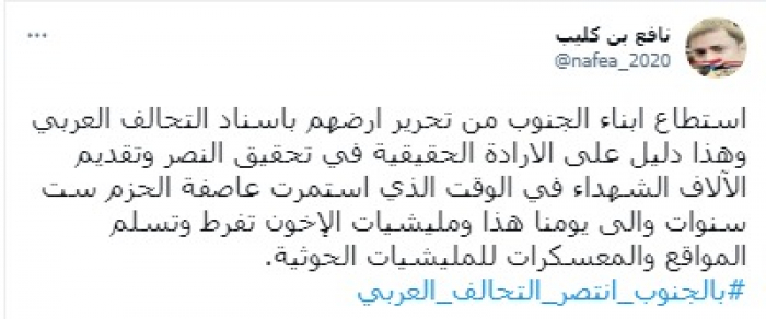 وشدد في تغريدة على حسابه بموقع التدوين المصغر تويتر، اليوم على أنه: "استطاع أبناء الجنوب تحرير أرضهم بإسناد التحالف العربي".