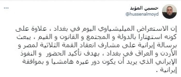 وشدد في تغريدة على حسابه بموقع التدوين المصغر تويتر، اليوم على أن: "الاستعراض الميليشياوي اليوم في بغداد، علاوة على كونه استهتارا بالدولة والمجتمع والقانون والقيم، يبعث برسالة إيرانية".